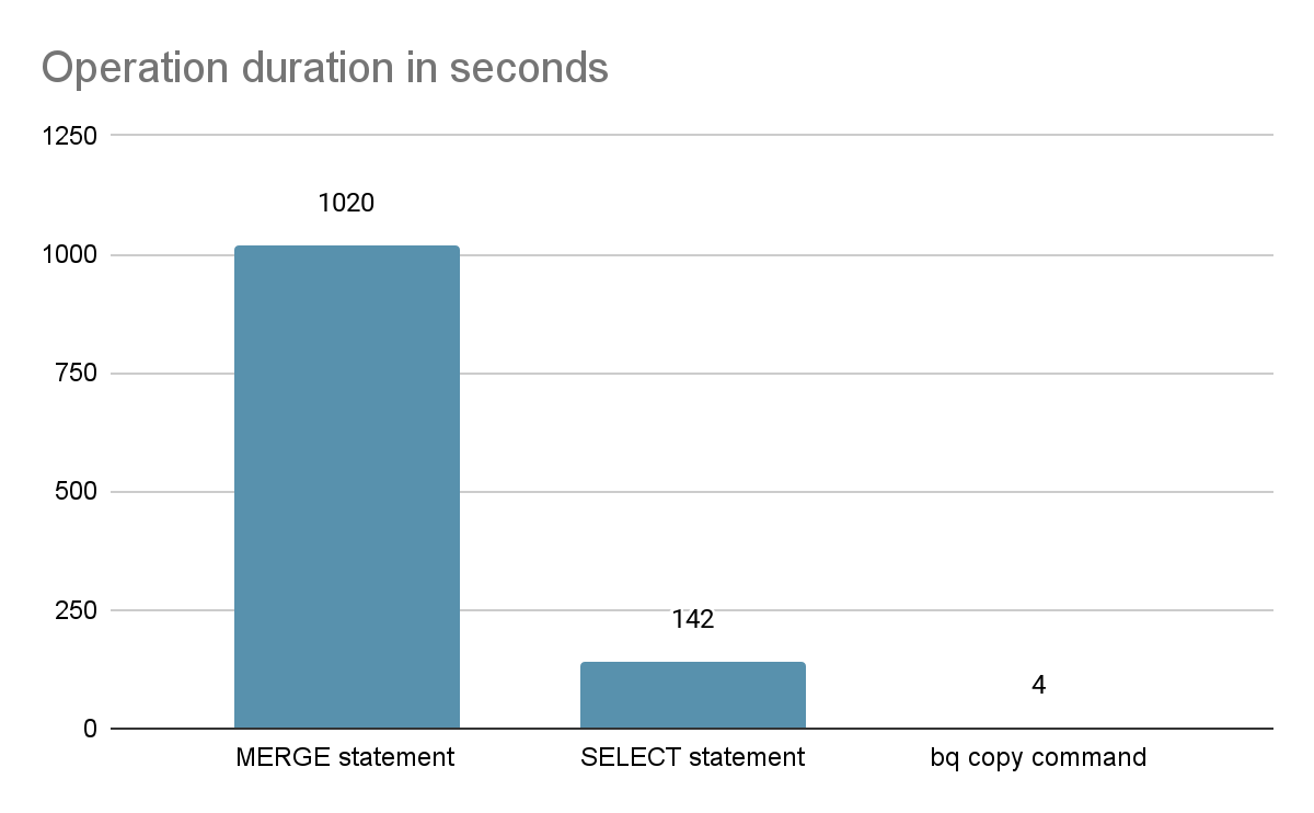 Of course, the MERGE statement offers much more flexibility than a WRITE_TRUNCATE query. Yet in most analytics workload cases, the queries are time series that are immutable - and therefore, either the destination partition is empty or we’ll likely have to reprocess a partial period so that it translates into overwriting every row in a subset of the existing partitions.
